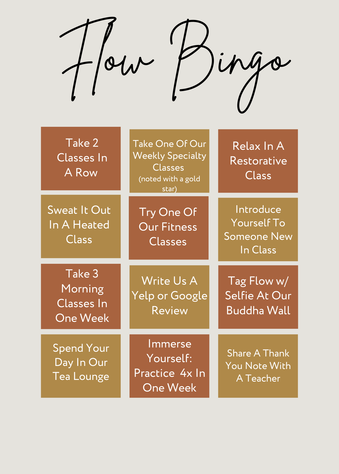 To submit your completed entry at the end of your month, simply take a pic of the bingo board above. Then use the “mark-up” tool on your phone or device to cross off the boxes you have completed. Email us your pic at happiness@flowyogacenter.com and we will validate your entry.